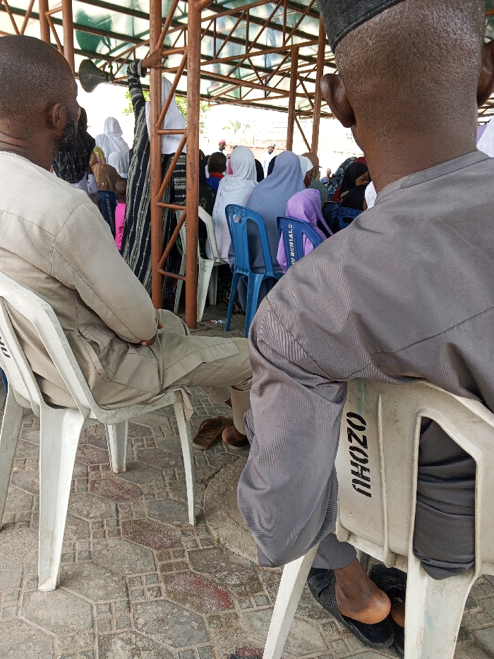 The scene depicts a gathering of individuals within a semi-covered structure in Nagazi, Nigeria