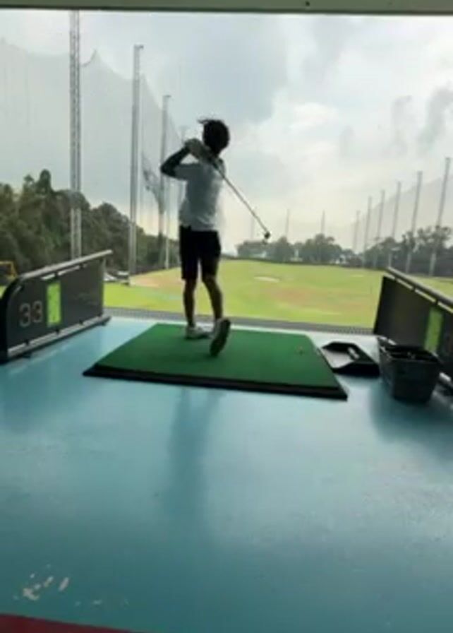 A person is shown in profile in a golf driving range. They are wearing a white t-shirt and dark shorts with white shoes. They swing a golf club. The floor of the range is blue and the area they stand on is a dark green square of simulated grass. The sky is overcast.