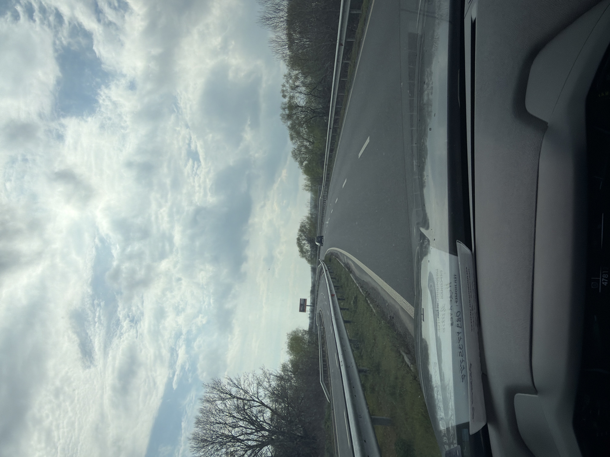 The image depicts a view from inside a moving vehicle on a highway. Outside the window, a grey, overcast sky is visible with streaks of blue. Trees are lining the highway with some bare from winter. The road surface is paved and shows white lane markings. In the foreground, the vehicle's interior is visible, including the dashboard and some paperwork attached to the windshield. There is no indication of Aheloy, Bulgaria, in the image.