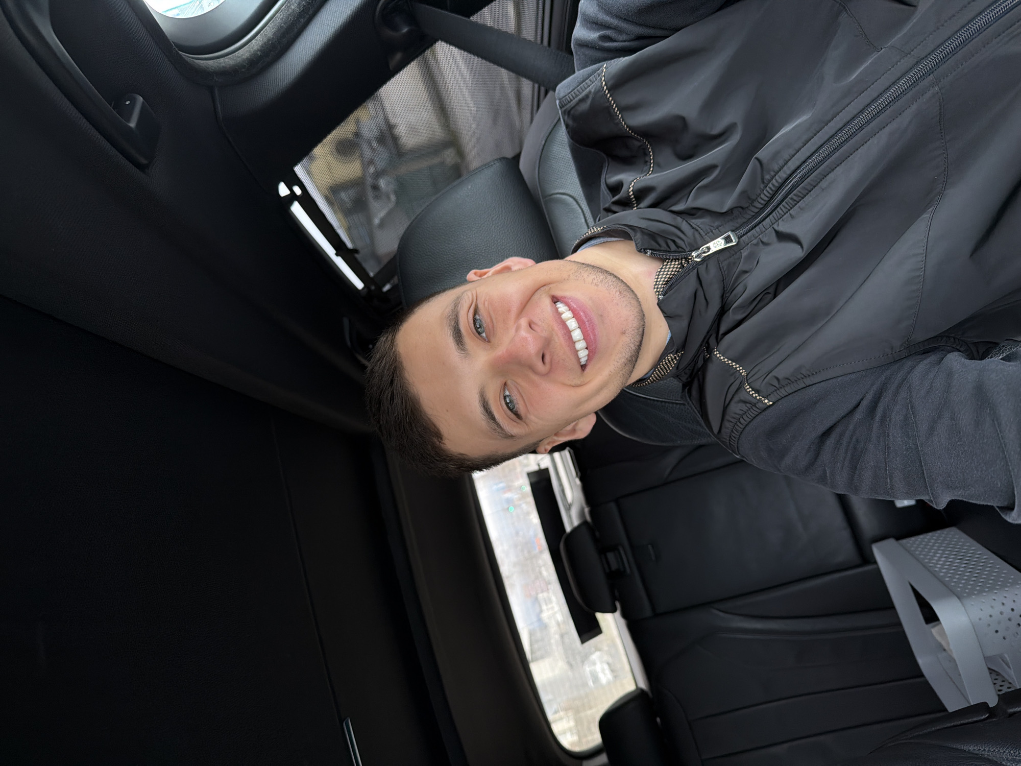 A young adult male is seated in the driver's seat of a vehicle, capturing a self-portrait