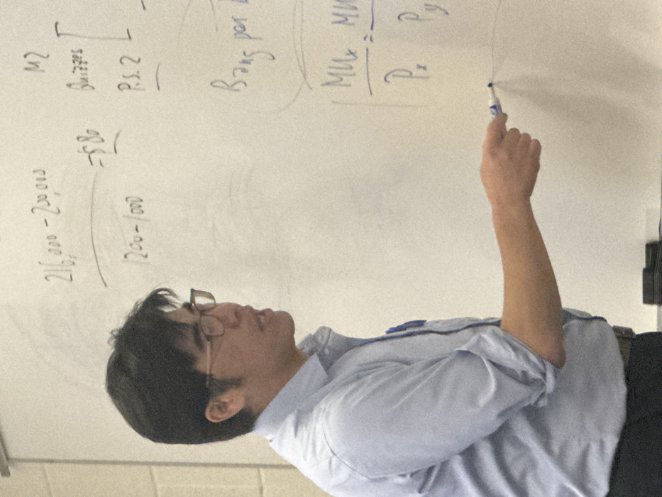 An East Asian male adult, estimated to be between 30 and 40 years old, is depicted standing in what appears to be a classroom or lecture hall at an educational institution in Gainesville, Florida, likely the University of Florida. He has short, dark hair and wears rectangular-framed glasses. He is dressed in a light blue long-sleeved button-down shirt with the sleeves rolled up to his forearms, dark trousers, and a light-colored belt. A dark pen is clipped to his left shirt pocket. The man is actively speaking, with his mouth slightly open, and is gesturing with a blue and white dry-erase marker in his right hand towards a large white board. The white board, which dominates the background, displays various handwritten notes and mathematical or economic equations in black marker. Visible elements include "216,000 - 200,000", "1200 - 1000", "= $80", "M2 Quizzes", "P.S. 2", "Bang per dollar", and "MUX/PX = MUY/PY". Dark markers or erasers are present on the bottom ledge of the white board. A light-colored concrete block wall is partially visible in the upper left background, behind the white board.