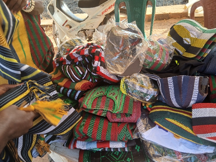 A colorful array of woven textiles and hats is displayed on a table. The textiles feature bold stripes in red, green, yellow, black, and white, stacked neatly. Several hats, some wrapped in plastic, are also present, showing the same vibrant patterns. A motorcycle is partially visible in the background, along with a green plastic chair, suggesting an outdoor market setting.