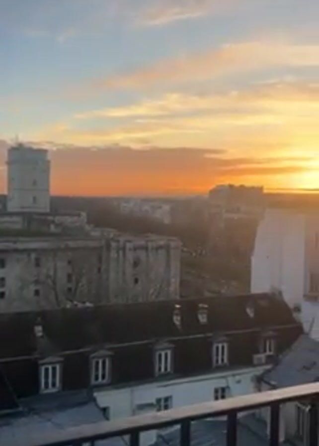 sunrise over a city. In the foreground, there is a black metal balcony railing. Behind the railing, the rooftops of white buildings with dark windows and slanted grey roofs are visible. In the distance, there are larger buildings and trees silhouetted against the sky. The sky is a mix of blue and orange colors, with the sun appearing as a bright orange orb near the horizon.