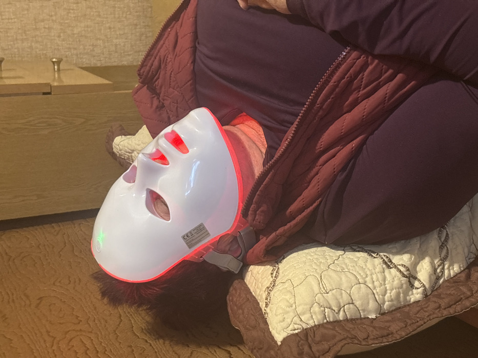 The image, reportedly captured in Yambol, Bulgaria, depicts an individual in an indoor setting, observed from a slightly elevated angle. The person is lying down, with their head resting on a cream-colored pillow featuring brown trim and quilted patterns. A white LED facial mask covers the individual's entire face, secured by a strap visible behind the head. The mask emits red light that is visible around the eye, nose, and mouth openings, and illuminates the skin of the face and neck. A small green light indicator is present on the upper-front surface of the mask. A regulatory label with "CE" marking is affixed to the lower-left side of the mask. The individual is dressed in a dark-colored, long-sleeved garment, partially obscured by an open, reddish-brown quilted vest with a zippered front. The background consists of light-toned wooden surfaces, likely furniture such as a cabinet or headboard, with a round, light-colored knob visible on the right side of the frame.