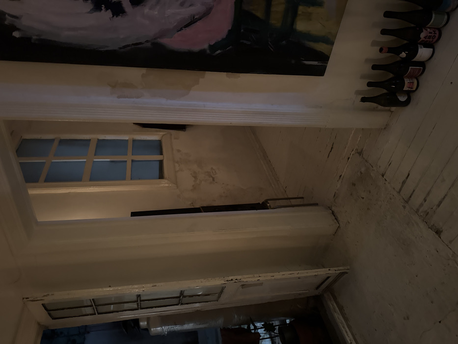 An interior shot of a room with a complex layout. A window with multiple panes is visible in the top left. The walls and woodwork appear old and painted white. A painting hangs above the window. Bottles, possibly wine, are displayed along the upper right edge of the frame. A second, smaller window or hatch is seen lower in the frame. The room is dimly lit.