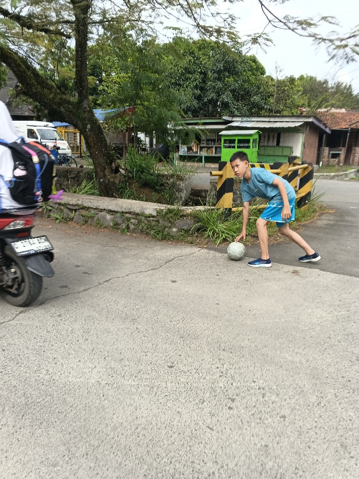 A daytime photograph taken at eye-level depicts a street scene in Dayeuhkolot, Indonesia. In the foreground to mid-ground, a young male, dressed in a light blue t-shirt, blue shorts, and blue athletic shoes, is actively engaged with a light-colored soccer ball on an asphalt road. He is crouched forward, right hand on the ball, with his head turned towards the left. Behind him, yellow and black striped road barriers border a concrete curb and an area of overgrown grass and small trees. To the far left, the rear section of a red motorcycle with a visible license plate "D 6763 ACA" is parked or in transit, with a partial view of a person wearing a white garment and a black backpack. The background features a cluster of simple, utilitarian structures, including a prominent green-fronted stall or shop, all situated beneath a dense canopy of green trees and a partially visible light blue sky. The asphalt road shows minor cracks and surface irregularities.