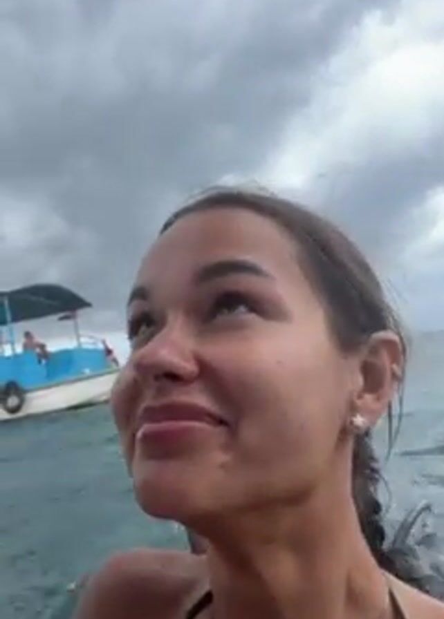 A person stands in water, holding a camera at eye level. The person smiles at the camera. A snorkeling mask is on their forehead. In the background is a boat with people on it. The camera turns upward, displaying the side of a white boat. The sky is overcast.