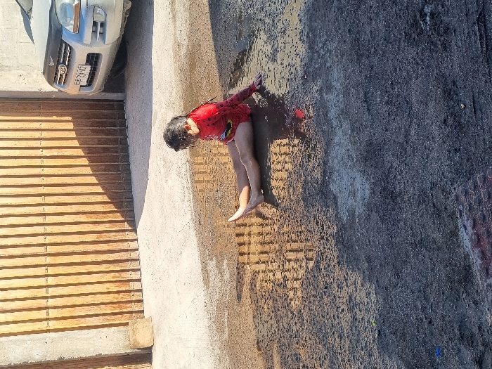 - "A child in a red and yellow swimsuit is washing on a concrete surface beside a car and a garage door" by FM-Ra39J3, licensed under CC BY 4.0