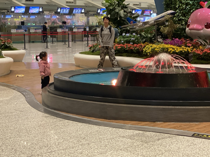 This image depicts an indoor scene within a modern terminal of Guangzhou Baiyun International Airport in Guangzhou City, China. The foreground features a light grey speckled terrazzo floor that transitions into a curved section of lighter, wood-grain patterned flooring. In the mid-ground, a multi-tiered, circular decorative water fountain serves as a central element. The lower basin of the fountain contains still blue water, while the upper tier, black in color, houses a spherical fixture from which multiple jets of water emanate upwards and outwards, illuminated with red light. A subtle orange glow is visible within the lower water basin. To the left of the fountain, a young female child, wearing a pink jacket and dark pants, stands in profile, facing right and observing the fountain. Her dark hair is styled into two pigtails. To the right of the fountain, an adult female stands facing the viewer. She is dressed in a light grey long-sleeved top, patterned sweatpants, and carries a light-colored backpack. Behind the fountain and the individuals is an elaborate landscaped area. This section features dense green foliage, various colorful flowers including yellow, purple, and red blooms. Integrated into this landscaping are decorative elements: a white model airplane with blue stripes is mounted above the plants, and a large, cartoonish pink figure with prominent eyes and a small red heart on its head is positioned to the right. In the far background, beyond the decorative landscaping, multiple airport check-in counters are visible. Each counter is equipped with digital display screens, some showing numbers such as "64," "63," and "65." Red stanchions with retractable belts demarcate queuing areas. A male figure in a dark suit is present near one of the check-in counters. A small yellow triangular floor sign is partially visible on the wood-patterned floor to the left, and a sign with Chinese characters reading "小心地滑" (Caution: Slippery Floor) is visible on the base of the fountain in the bottom right corner. The entire scene is brightly illuminated by overhead artificial lighting.