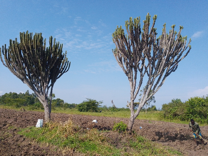 Two tall, cactus-like trees stand prominently in a cultivated field under a bright, slightly cloudy sky
