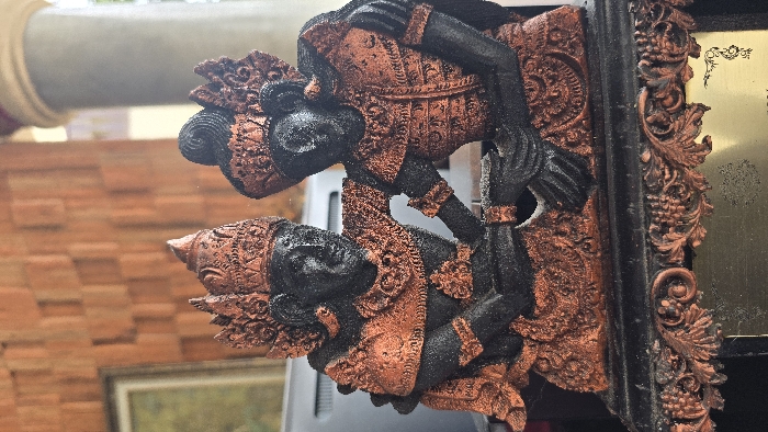 Two figures, adorned in intricate copper and black attire, are the focal point. The top figure leans down towards the other, who is positioned below. Both figures wear elaborate headpieces and regal clothing. They're mounted on a frame with carved grapes and leaves. A blurred brick wall and a window frame are visible in the background, adding context to the artistic display.