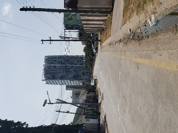 This daytime image captures a street scene in Dar es-Salaam, Tanzania, under clear skies. The perspective is from ground level, looking northeast up a concrete or asphalt road that gently slopes upward and curves slightly to the left in the distance. The road features a worn yellow edge line on the right side and two recessed drainage grates on the left. The immediate foreground on the right consists of a dirt shoulder containing scattered refuse, including a white plastic container and a blue plastic bottle. A shallow, dark-colored drainage ditch with stagnant water and additional debris runs along the rightmost edge. On the far left, dense, dark green foliage from a large tree is partially visible. The midground features low-rise, light-colored buildings with green roofs on the left. Multiple utility poles with numerous overhead power lines crisscross the frame, one of which supports a solar-powered street light. A white sedan is parked on the left shoulder. On the right, a series of light-colored concrete barriers or fence sections runs parallel to the road, behind which large billboards with green imagery are partially visible. Several vehicles, including sedans, are parked on the right shoulder further along the road. Faint human figures are discernible walking in the distant midground. The background is dominated by a tall, multi-story, modern high-rise building with a grid-patterned glass and concrete facade, appearing either under construction or recently completed. The word "BANK" is visible near its apex. This building is identified as the AICC Tower. Other smaller structures are visible in the far distance, blending with the hazy sky. No distinct human actions or direct interactions are clearly observable.