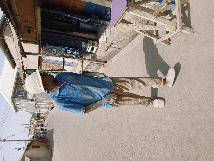 The image displays a daytime street scene in Gweru, Zimbabwe. In the foreground, an adult male stands on a paved asphalt road. He wears a light-colored bucket hat, a light blue polo shirt, light brown trousers, and light-colored slip-on shoes. All visible clothing and his light-colored gloves are extensively dusted with a white powdery substance. He is oriented towards the right side of the frame, with his head turned slightly left. To his immediate right, a small, roughly constructed wooden stand with a purple top rests on the ground, also coated in white dust. Behind the stand, a single-story building features an exposed red brick base, a light-colored plastered upper section, and an overhanging corrugated metal roof. A dark gate or door is visible at the building's entrance, adorned with colorful draped textiles. In the mid-ground, the asphalt street extends, occupied by several pedestrians walking away from the viewer. Buildings of various sizes and construction materials, including a prominent two-story light grey structure with a white hip roof, line both sides of the street. Utility poles and overhead lines are present. The sky is clear, indicating bright sunlight, with distinct shadows cast on the ground.