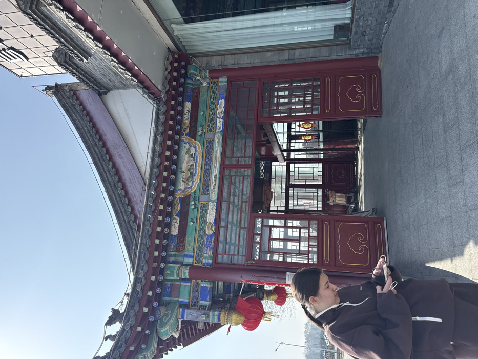 A forensic description of the image reveals an outdoor scene in Chaoyang District, China, under a clear sky. The central subject is a traditional Chinese-style building featuring a dark red wooden structural frame with intricate, multi-colored decorative elements including blues, greens, yellows, and white. The building exhibits a distinctive curved, dark-tiled roof with ornate eaves, from which two red traditional lanterns with tassels hang on the left side. Decorative friezes depicting landscapes are visible beneath the roofline. The entrance area consists of several red-framed glass panels and doors, some open, revealing an interior with similar traditional design and additional red decorations. To the right of the traditional structure, a more modern building with a dark, possibly brick or panel facade and a large glass window with light-colored curtains is visible. In the foreground, slightly to the left, a female individual is present. She has dark hair, pulled back into a ponytail, and is wearing a dark brown quarter-zip top with white accents. She is standing on a paved walkway composed of light grey interlocking tiles, looking down intently at a white smartphone held in both hands. White earbuds or a charging cable are visible near her hands. Bright sunlight illuminates the scene, creating distinct shadows on the ground.