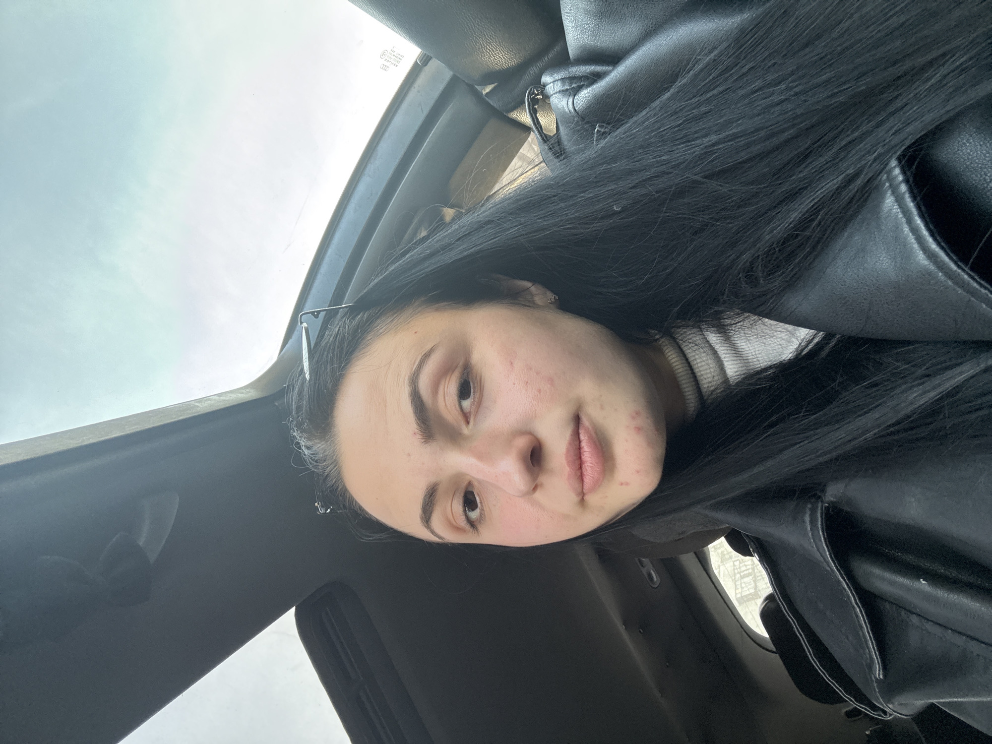 A close-up selfie captures a young adult female situated within the passenger compartment of a vehicle. The subject, positioned centrally, has long, straight, dark black hair, parted off-center. Her skin is fair, exhibiting scattered facial blemishes and redness on her cheeks and chin. She wears a light-colored, possibly off-white, ribbed turtleneck sweater beneath a black leather-like jacket. Her expression is neutral, with her eyes directly engaging the camera. The vehicle's interior features dark headliner material above, with a visible sunroof exposing an overcast, bright sky. To the subject's right, a side window displays a partial "AUDI" brand logo on the glass or interior trim. Dark, possibly leather, upholstery is visible behind and to the right of the subject. Through a rear window, a blurred urban landscape comprising indistinct buildings and structures is discernible, suggesting a city environment. While the prompt specifies the location as Yambol, Bulgaria, there are no specific visual cues within the photographic evidence to confirm this geographic location.