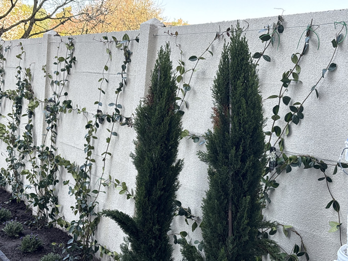 The scene depicts a section of a garden wall located in Antwerp, Belgium. A light-colored, textured concrete or stucco wall, composed of rectangular segments, spans the background. Numerous dark green climbing plants with small, oval leaves are trained vertically and horizontally across the wall, secured by thin wires or strings attached with small hooks. In the foreground, two slender, columnar evergreen conifer trees, possibly Italian Cypress, stand erect. The conifer on the right is fully visible, while a portion of a second is present on the left. Both conifers exhibit some brown discoloration among their dark green foliage. A narrow strip of dark, cultivated soil borders the base of the wall, containing small, mounded green groundcover plants. A white plant label with black text and an image hangs from one of the climbing vines near the right conifer. Overhead, a pale sky is visible, with bare tree branches against it in the upper left. The area is lit by natural daylight. No individuals or animals are present.