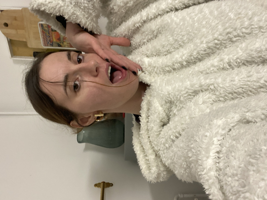 A woman with light skin, brown hair and eyes, and black nail polish poses dramatically. Her mouth is open and her hand is on her cheek. She wears a fluffy white robe or jacket. Behind her are a pale green vase, a white wall, and a wooden cutting board. A single strand of hair hangs across her face. The image appears to be a selfie taken indoors.