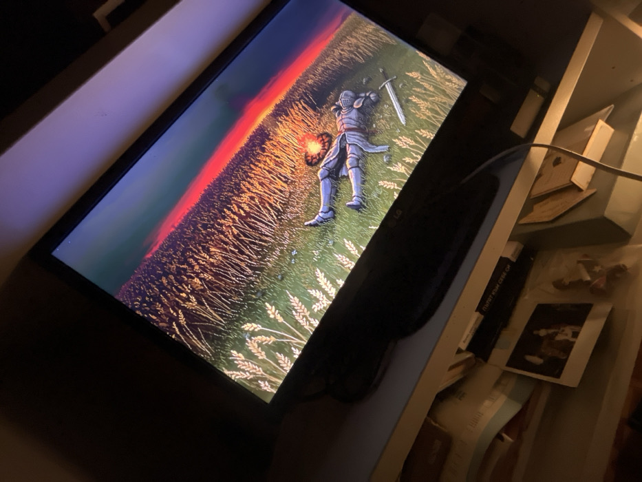 The image displays an LG computer monitor displaying a digital illustration, situated on a light-colored desk within a dimly lit room in Dolni Chiflik, Bulgaria. The monitor is angled slightly, showing an illustration of a knight in silver full plate armor lying supine on a field of green grass interspersed with golden wheat stalks. A silver longsword rests on the grass near the knight's left hip. A small, glowing orange, circular flame or campfire is depicted approximately at the knight's midsection. The background shows a sky transitioning from a dark blue/purple at the top to a vibrant red-orange hue at the horizon, consistent with a sunset or sunrise. Below the monitor, on the desk surface, are several objects: a small, rectangular photographic print depicting two human figures, a transparent plastic bag containing several dark, indistinct items, and other papers or books. A dark electrical cable is visible extending from the right side of the desk towards the base of the monitor. The surrounding walls appear dark due to low ambient light.