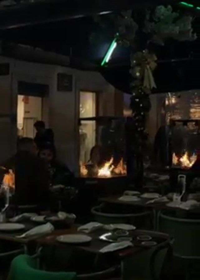 n outdoor restaurant at night. There are several tables with plates and cutlery set for diners. Some tables are occupied by people, others are empty. In the center of the outdoor dining area, there are round, tall fire pits with flames visible. The seating area is covered by an awning with green and white neon lighting. There's a doorway leading into what appears to be the indoor part of the restaurant. People can be seen walking both inside and outside.