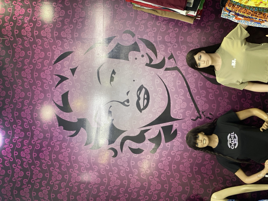 A pink and purple patterned wall features a large stencil of Marilyn Monroe's face. Two mannequins stand against the wall on the right side of the image. One wears a beige t-shirt, and the other is dressed in a black t-shirt with "Chanel" printed on it. Clothing racks are visible in the upper right corner of the image.