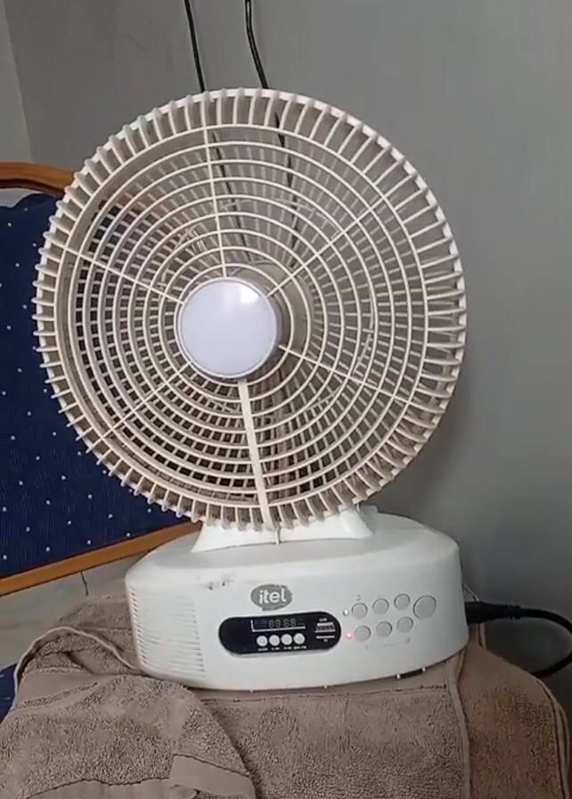 A white, circular ITEL fan is seen operating indoors, oscillating back and forth while seated on a brown towel-covered surface