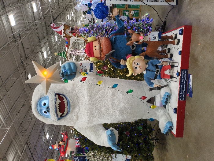 A large holiday display features iconic characters. A smiling Abominable Snowman towers, illuminated by a star on its head and string lights. Above him are animated figures of Yukon Cornelius, Rudolph, and Hermey the Elf, all on a snow-covered base. The display is surrounded by decorated Christmas trees and holiday decorations, suggesting it's in a retail environment. A sign advises against climbing on the display.