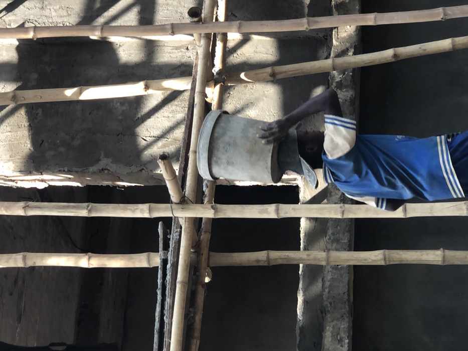 At a construction site in Alor, Nigeria, a single individual is depicted in profile, facing left. The person is wearing a blue short-sleeved shirt with white horizontal stripes on the sleeves and blue lower garments. A light-colored, cylindrical bucket rests on their head, supported by a wider, possibly grey, hat-like object beneath it. The individual's right arm is slightly raised, with the hand near the head, seemingly steadying the load. The background features an unfinished concrete building structure with multiple bamboo poles forming a scaffolding system, both vertical and horizontal. Strong sunlight from the right casts distinct shadows on the concrete walls and the bamboo scaffolding.