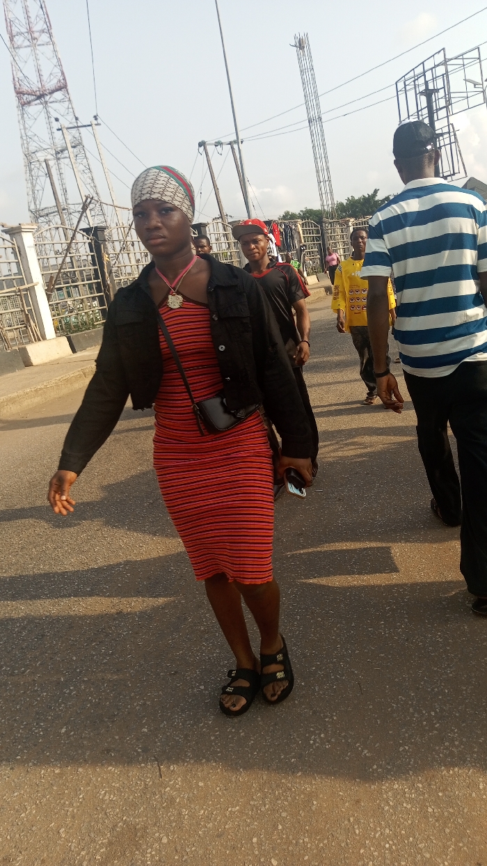 A woman stands in the foreground, slightly angled toward the left, looking directly forward. She wears a cream-colored headwrap with a repeated dark pattern, a black cropped denim jacket, a red and black horizontally striped sleeveless midi-dress, and black slide sandals with two straps adorned with silver elements. A small black crossbody bag with a thin strap rests on her right hip. A pink ribbon necklace with a silver-colored circular pendant hangs around her neck. Her right arm is extended slightly forward, and her left hand holds a smartphone. The asphalt road surface is visible beneath her. Behind her, several individuals are partially visible, walking or standing. To her right and slightly behind, a man in a black and red t-shirt and a red baseball cap walks to the right. Further back, another man in a yellow t-shirt walks to the right. To the far right, a man in a blue and white striped t-shirt and black pants walks away from the camera. The background features various urban structures under a bright, clear sky. A large metal lattice tower is prominent on the left. Utility poles with overhead wires run across the mid-ground. A metal gate and fence are visible behind the walking figures. On the right, incomplete or skeletal metal billboard structures are present. Distant greenery can be seen on the horizon. The scene is illuminated by natural light, casting distinct shadows on the ground.
