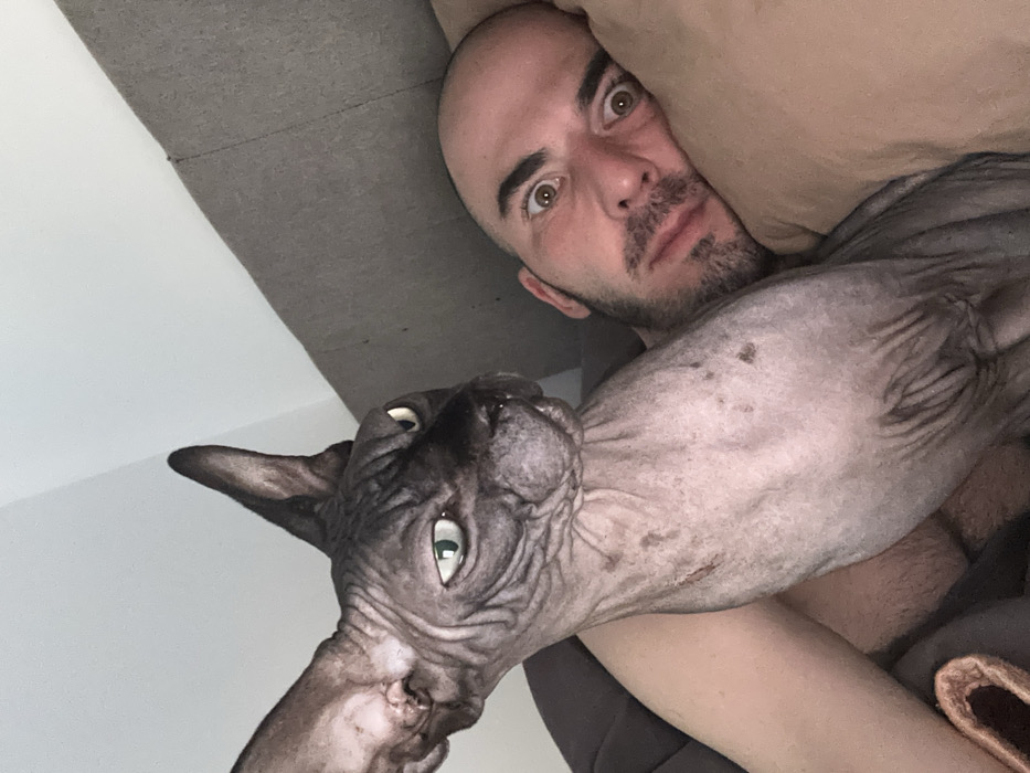 A bald man with a short beard stares wide-eyed at the camera, his head resting on a beige pillow. He tightly embraces a gray Sphynx cat, its wrinkled skin and prominent ears visible. The cat also stares intently, its green eyes open. The backdrop shows a white wall and a gray surface, possibly a couch or headboard. The image seems to be a close-up selfie capturing a moment of shared surprise.