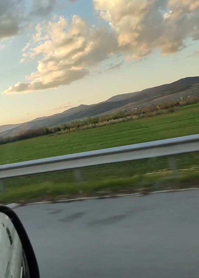 car driving on a highway, with a green field and mountains visible in the background. The sky is cloudy, with the sun setting in the distance. A billboard is visible on the side of the road. The camera appears to be mounted inside the car. There is music playing in the background.