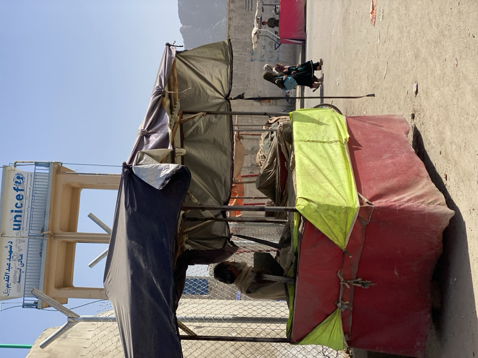 A street vendor operates a small stall constructed of metal poles and fabric coverings in shades of red, yellow, black and grey. The stall is situated near a UNICEF water tower and a chain-link fence. A person is visible inside the stall. In the background, other figures walk along a paved area, with a mountain range visible further away. The scene is bathed in bright daylight.