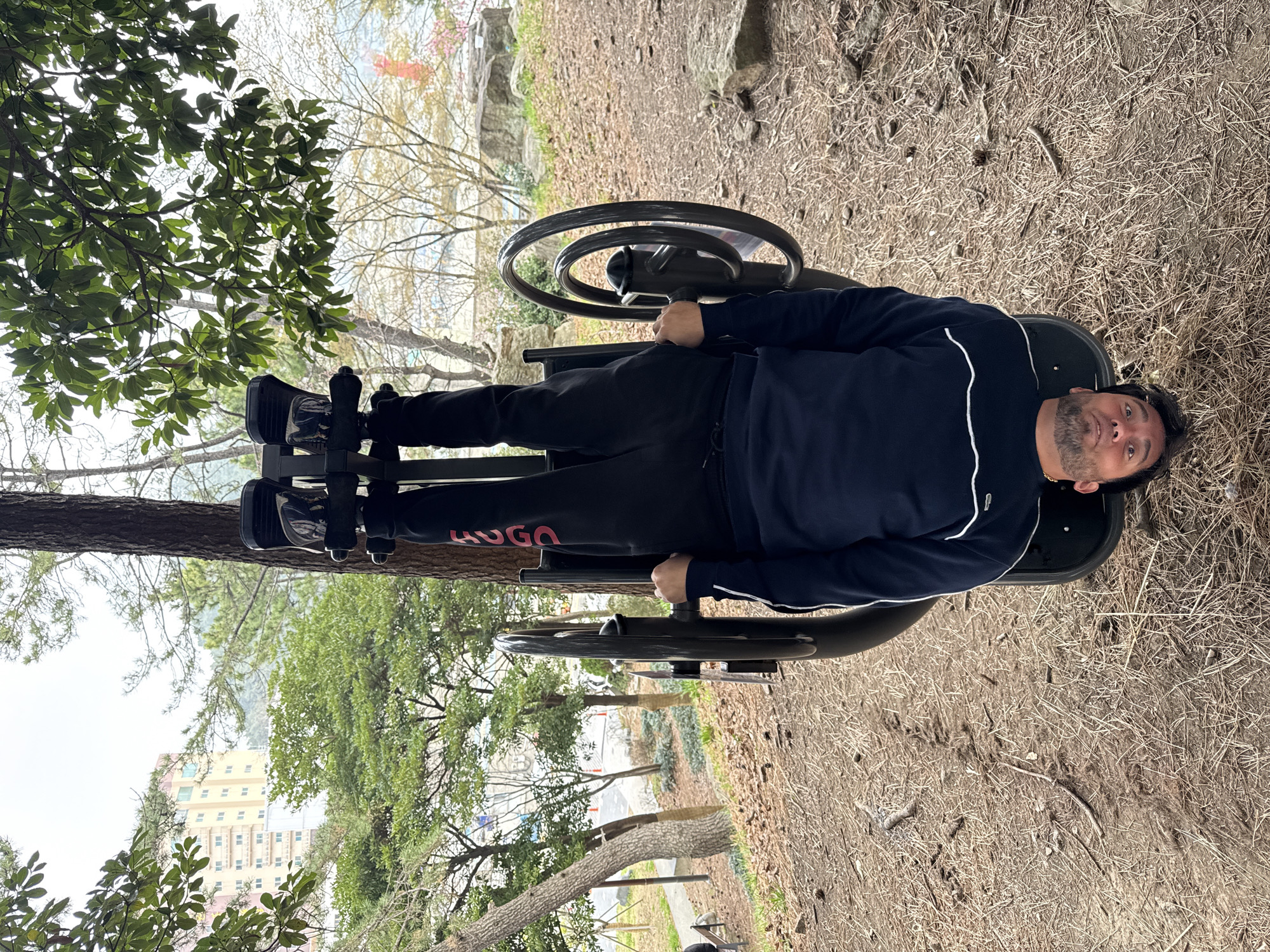 - "A man wearing a blue long-sleeve shirt with a white stripe, black sweatpants with the word "HUGO" in red letters, and black sneakers is lying in a piece of workout equipment in a park" by FM-LQAZF2, licensed under CC BY 4.0