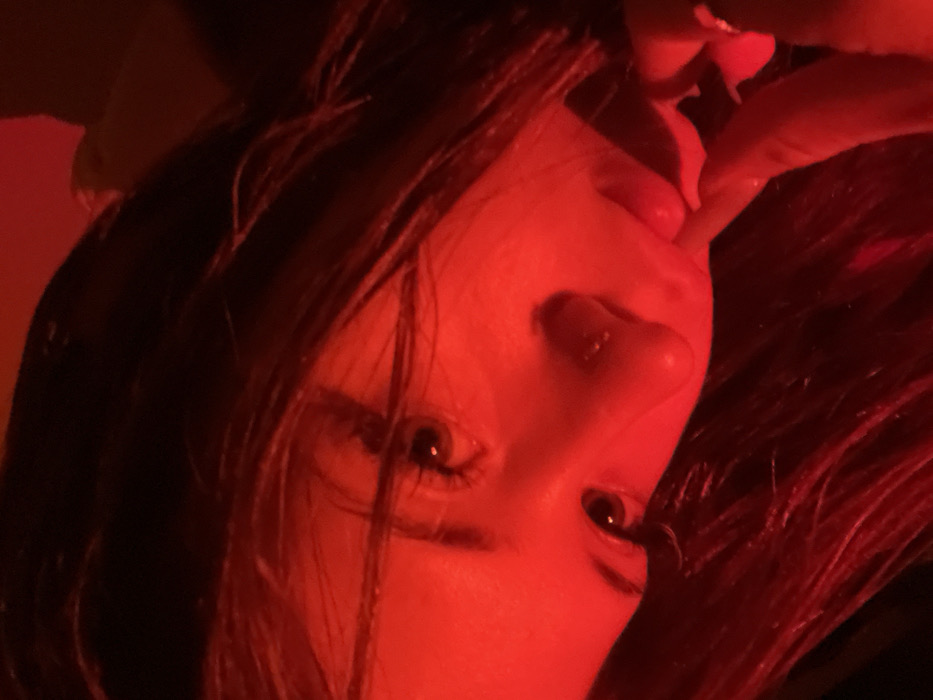 This close-up portrait, taken in Raanana, Israel, features a person, likely female, illuminated by intense red light