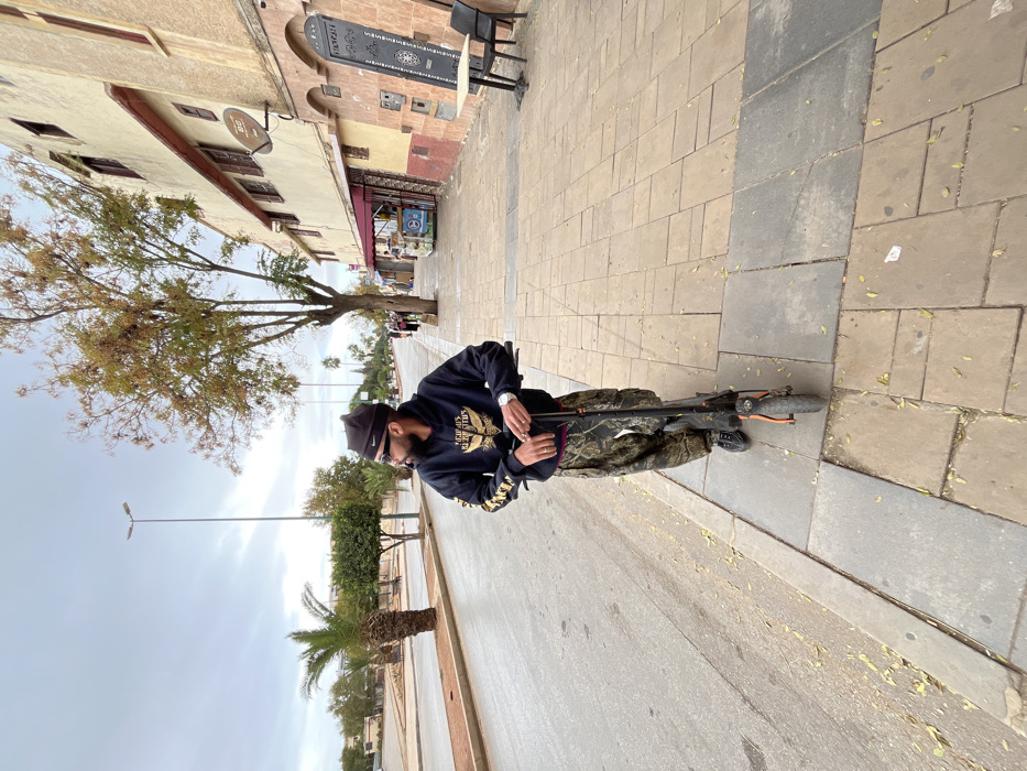 An outdoor, eye-level street view in Meknes, Morocco, depicts a male individual standing on a tiled sidewalk, holding an electric scooter