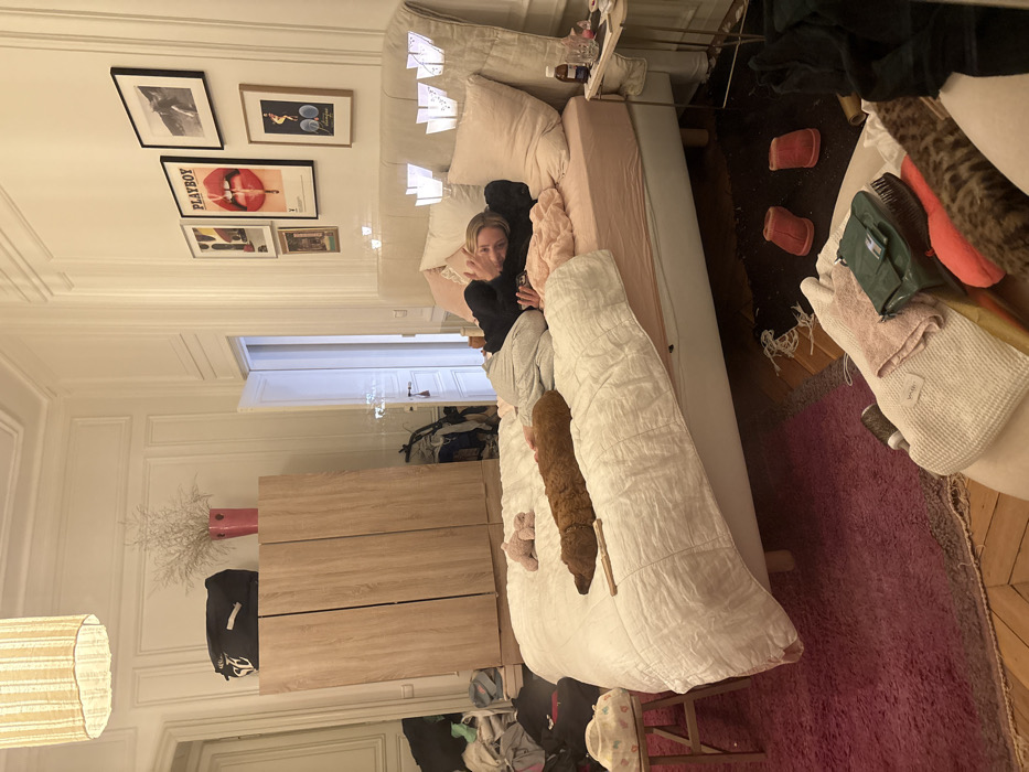 The scene depicts an untidy bedroom within a residential building, consistent with the architectural style found in Paris, France, evidenced by the ornate white wall paneling (boiserie), high ceilings, and parquet flooring. A light-skinned female with blonde hair is lying on her left side in a large bed with a beige upholstered headboard, wearing a dark long-sleeved shirt and light-colored pajama bottoms. Her right hand is raised, fingers spread, directed towards the camera. A reddish-brown, medium-sized dog is stretched out on the white quilted duvet beside her. To the left, a light-wood triple-door wardrobe holds a black duffel bag and a pink vase with dried white flora. Piles of clothes and miscellaneous items are scattered on the floor and on a small wooden stool near the bed on the left. On the right side of the bed, a small metal nightstand holds a brown bottle, a glass, and other small objects. The wall above the bed features a gallery arrangement of framed art, including a prominent "Playboy" poster with red lips. Small white decorative lights are affixed to the headboard. Two reddish-pink slippers are visible on the floor in the foreground. The room is illuminated by artificial light from a ceiling fixture and possibly other sources, with reflections visible on surfaces.