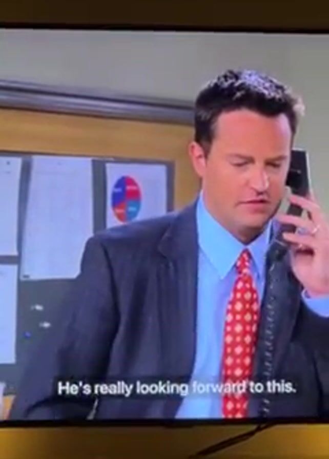 scene from the television show "Friends" featuring the characters Chandler and Monica. Chandler, wearing a blue striped suit and red patterned tie, is on the phone in an office setting. There are papers and a pie chart visible behind him. He is laughing at something someone says. Monica, wearing a brown sweater, is shown on the phone, sitting on a patterned couch. Subtitles are present at the bottom of the screen, displaying lines from the dialogue.
