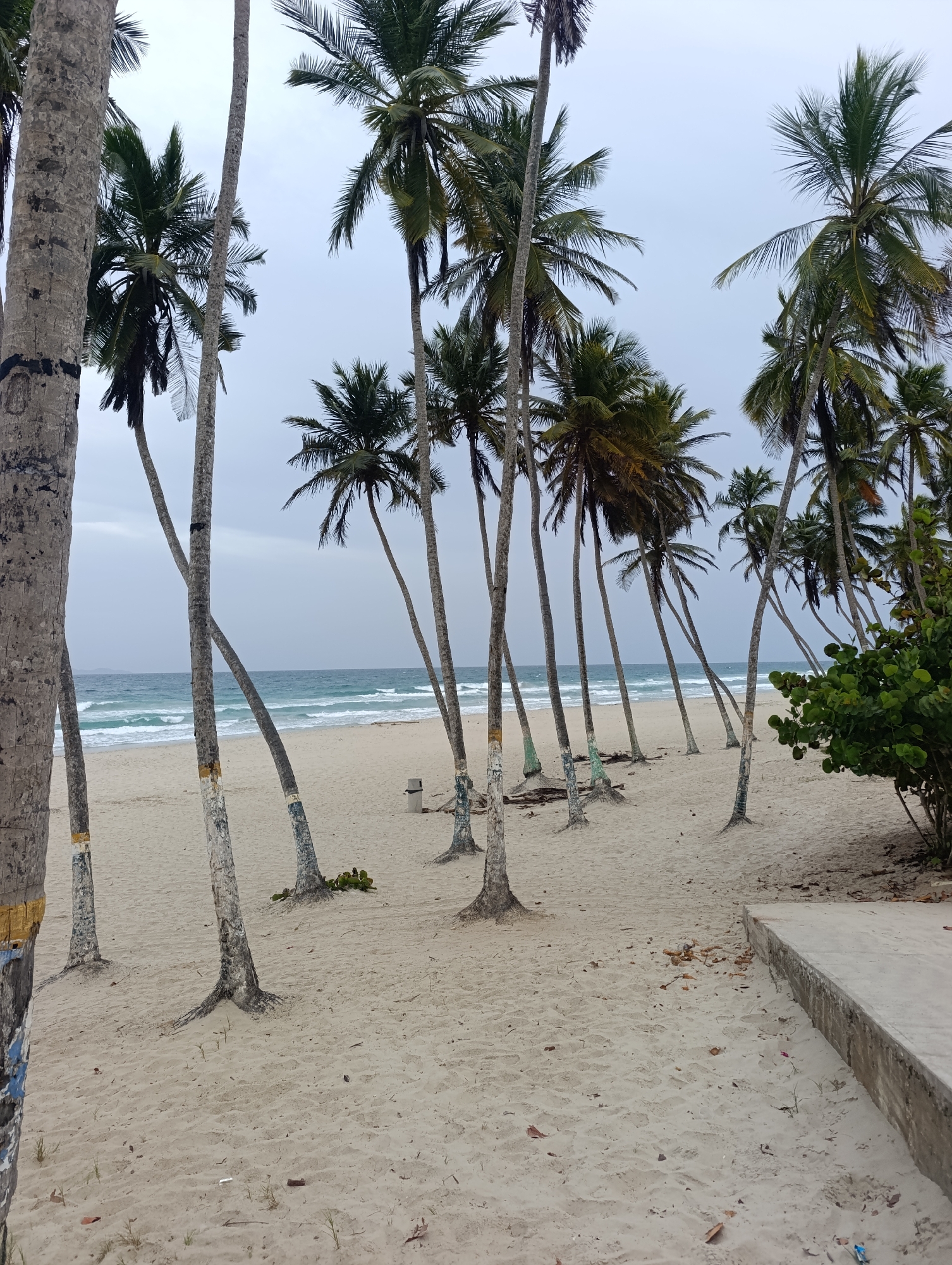 The image depicts a beach landscape in an unidentified location. Several palm trees stand along the shoreline, their trunks marked with varying colors, suggesting human intervention. The sand is light in color, and gentle waves can be seen meeting the shore. The sky is overcast. A concrete structure is visible at the edge of the sand, near some green vegetation. The scene is devoid of people.