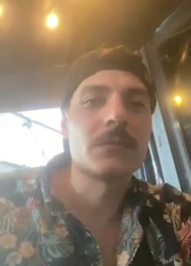 man with a mustache and dark hair wearing a black cap and a floral shirt