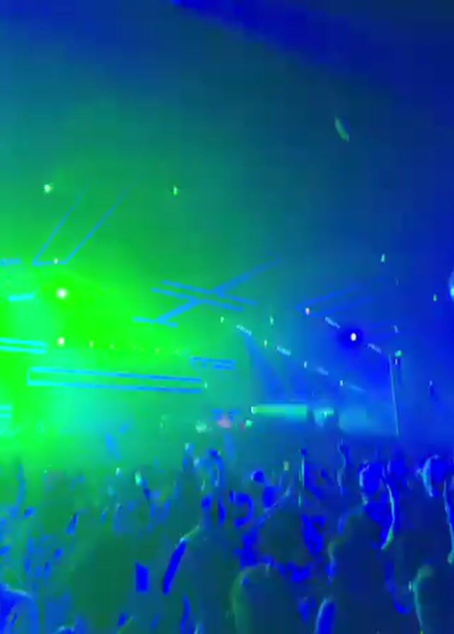 A crowd is dancing at a concert in a dark venue, their silhouettes contrasting with the bright, dynamic lighting. Alternating beams of blue and green create a vivid, energized atmosphere. The light show features multiple horizontal lines and scattered spots, illuminating the space. The audience appears captivated, with many holding up phones. The overall scene captures the excitement and energy of a live music event.