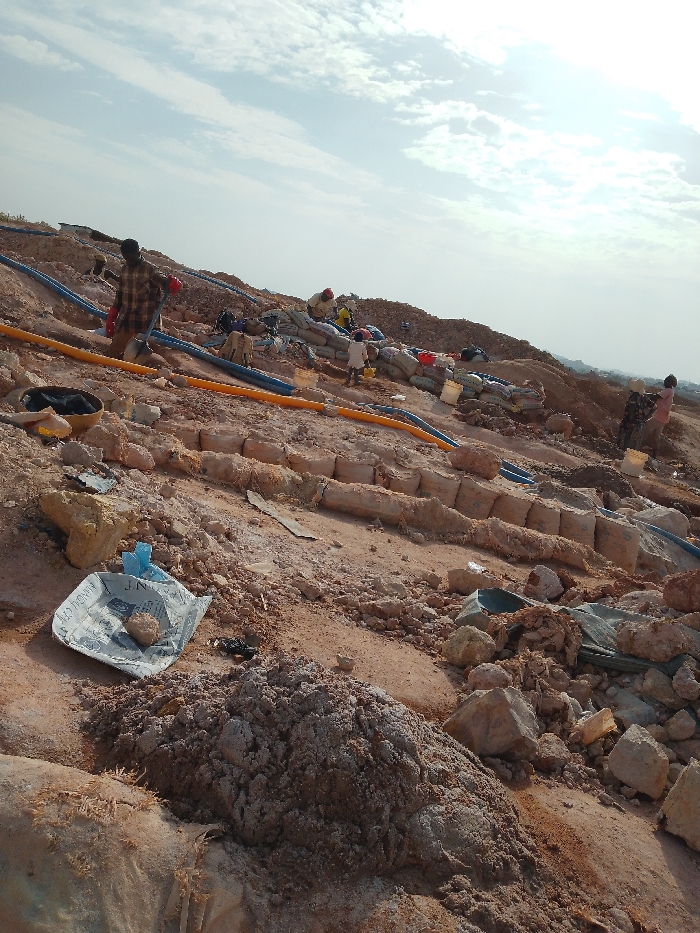 The image displays a large outdoor site characterized by extensive earth-moving activity under a partially cloudy, light blue sky in Unknown, Unknown. The terrain consists of reddish-brown, dry, disturbed soil, rocks, and rubble, forming a significant slope or hill. Approximately six to seven individuals are present, engaged in manual labor. In the foreground, left-center, an adult male wearing a plaid shirt and red gloves stands holding a shovel, facing right. Nearby on the ground, a black basin and a crumpled white bag with visible text ("NGUATJ.CH") containing a small rock are present. Numerous blue and yellow-orange flexible pipes snake across the sloped ground, suggesting material transport. In the mid-ground, several individuals are clustered around stacks of white or light-colored sacks, some forming layered, low retaining structures. One person wears a yellow hard hat or head covering, and another, possibly a child, is visible in a light shirt near the sacks. White and red plastic buckets are scattered among the sacks. On the far right, an individual in a pink or light-colored shirt stands near a dark object. The background reveals additional barren hills and distant, indistinct structures. The environment is arid with no visible vegetation.