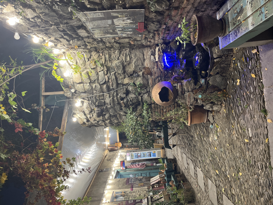 The image displays an illuminated outdoor alleyway or courtyard in Tbilisi, Georgia, captured at night. The ground consists of a cobblestone pathway, interspersed with rectangular flat pavers, and lightly scattered with yellow leaves. On the right side of the alley, a tall, rugged wall constructed from large, irregular stones and sections of red brick rises vertically. Numerous warm-toned string lights are strung across this stone wall. A large, framed black-and-white photograph or poster is mounted high on the upper right section of this wall, and directly below it, a red arrow sign points left. Beneath the arrow, a small, multi-tiered water feature is integrated into the stonework, surrounded by natural rocks and a small potted plant; it emits a distinct blue luminescence. To the left of the water feature, a large earthenware sphere, approximately 60cm in diameter with a prominent circular opening, rests on a stone base. Another potted plant sits on the ground to its left, adjacent to a weathered green and blue tiled bench visible in the lower right foreground. On the left side of the alley, a lighter-colored wall, appearing to be plastered, runs parallel to the stone wall, also adorned with string lights. Various items, possibly crafts or merchandise, are displayed along this wall on wooden pallets or crates arranged as display stands. Further down the alley on the left, a light blue wooden door is visible. A tall, white commercial refrigerator with a glass front, stocked with multiple bottled beverages, is positioned beyond the display stands. A foldable table with a dark green tablecloth is situated in the mid-ground, slightly left of the center. Overhead, a translucent white tarp or roof structure partially covers the alley, beneath which additional string lights are suspended. Autumnal foliage with red and green leaves hangs into the upper frame from natural growth, partially obscuring the dark night sky. A musical instrument, possibly a guitar, is seen hanging on a distant wall. No individuals are present within the depicted scene.