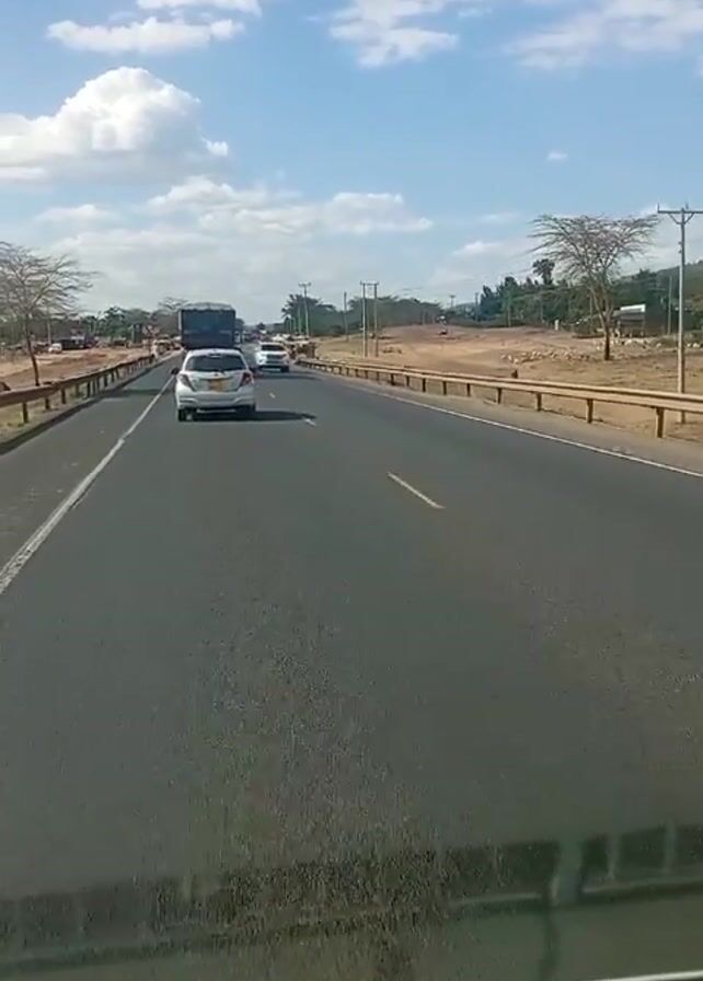 view from inside a vehicle driving on a two-lane asphalt road. A white car is driving in front of the vehicle in the same lane, and a truck is further ahead. On the opposite side of the road, there is oncoming traffic. The road has a guardrail on the right side, and the landscape on both sides is primarily dry and grassy with scattered trees and utility poles. The sky is blue with scattered white clouds. The overall scene is a typical daytime road setting in a rural or semi-rural area.