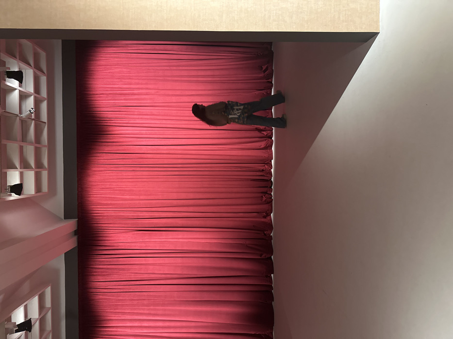 An indoor scene in what is presumed to be a gallery, studio, or event space in Tel-Aviv, Israel, features a single individual walking across a large, brightly illuminated stage or exhibition area. The background is dominated by a wall-to-wall, floor-to-ceiling crimson red velvet curtain, densely pleated and extending horizontally across the entire frame. Above the curtain, a white ceiling with a light pink-toned grid structure contains multiple black track lights or spotlights, two of which are visible in the upper left and two in the upper right. White structural beams are also present on the ceiling. The floor is a light grey or off-white, unmarked surface. A distinct triangular shadow, cast by an unseen light source, originates from the bottom right corner and extends inwards towards the center of the floor, creating a diagonal line. A sole person, with long, dark hair, is positioned in the mid-ground, walking from left to right. They are seen in profile, their face partially obscured by shadow. The individual wears dark blue, loose-fitting pants (possibly jeans) and a patterned top or jacket, featuring visible light-colored lettering or design elements on the back, resembling "V&L". They are wearing light-colored footwear. The person's form is somewhat silhouetted against the brightly lit red curtain. No other individuals or interactions are observed. A vertical beige-colored wall panel is visible on the far right edge of the frame, partially obscuring the scene.