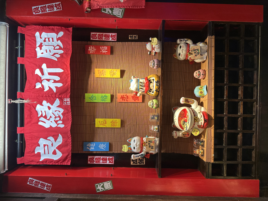 The image displays a retail or display alcove, framed by prominent red panels, characteristic of a commercial establishment in New Taipei City, Taiwan. A woven bamboo mat serves as the central background for two dark wooden display shelves. Above, a red fabric banner with white Japanese characters reads "良緣祈願" (Prayer for good match/relationship). Six colored vertical strips are suspended against the bamboo, each bearing a single Japanese word: blue for "健康" (Health), yellow for "厄除" (Ward off evil), green for "合格" (Passing an exam/success), orange for "恋愛" (Love), another yellow for "富貴" (Wealth/Prosperity), and red for "幸福" (Happiness). The top shelf presents a collection of figures: a white Maneki-Neko (beckoning cat) with a raised left paw and a price tag of "1500," a larger, stacked figure resembling a Maneki-Neko atop a Daruma doll, inscribed with "大勝" (Big Win), two miniature Maneki-Neko enclosed in clear boxes, a green Daruma doll, and two additional small, egg-shaped figures. The bottom shelf holds a similar assortment: a large white Maneki-Neko with both paws raised, two small items in clear cases, a blue cap adorned with a sunflower design, a pink egg-shaped figure, and another white Maneki-Neko with a raised right paw and a price tag of "800." Affixed to the red side panels are several white-on-red stickers reading "良緣達成" (Good match achieved) and a green sticker on the left panel marked "大豐" (Great harvest/abundance). The lower portion of the display features a dark wooden cubby shelving unit with multiple square compartments. No people are visible; the scene is a static arrangement of merchandise.