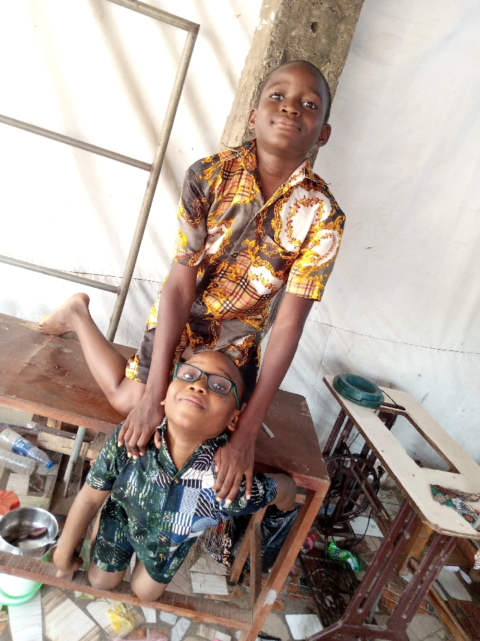 Two young males are depicted in an indoor or semi-enclosed setting within the city of Unknown, Unknown. The primary subject, an adolescent male, stands barefoot on a wooden table or platform, with his right leg bent. He wears a short-sleeved button-up shirt featuring a complex pattern of gold chains, plaid, and other motifs, over dark shorts. He has his hands resting on the shoulders of a younger male, who is positioned on a lower wooden surface, possibly kneeling. This second subject wears green-framed eyeglasses and a short-sleeved button-up shirt with a blue, green, and white geometric pattern. Both individuals have dark skin, short dark hair, and are looking directly at the camera with slight smiles. The environment includes several wooden tables; one to the right features a rectangular cutout consistent with a sewing machine workstation, upon which a green spool of thread is visible. A metal ladder-like frame leans against a plain white fabric or tarp wall on the left. A rough concrete pillar or beam is visible in the upper right background. The floor is tiled with light-colored, patterned ceramic or concrete tiles. Scattered around the base of the tables are several plastic water bottles, a small metal bowl containing dark material, and miscellaneous debris.