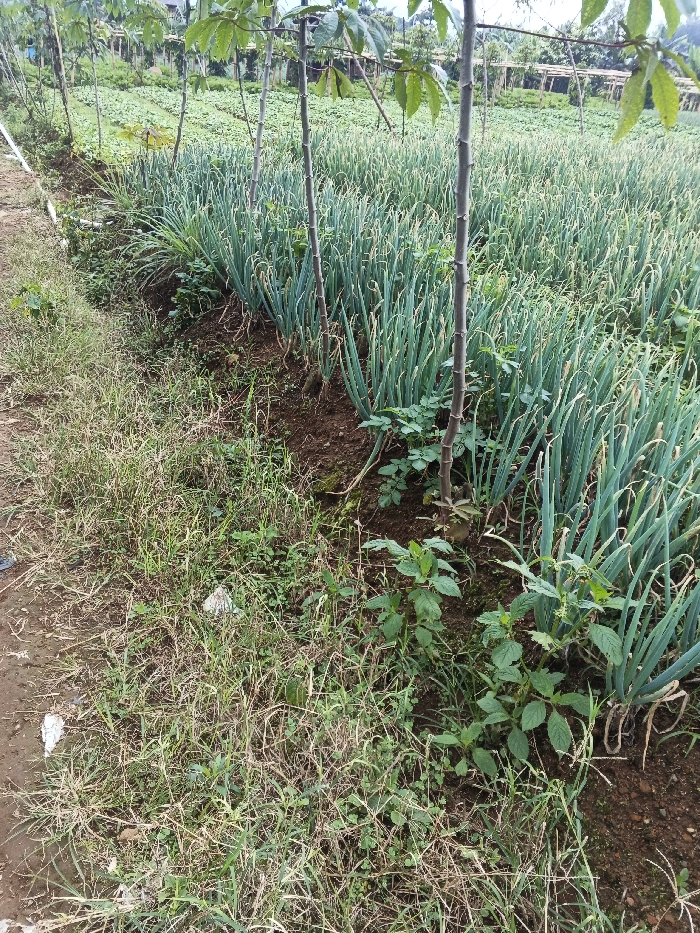 The scene depicts an agricultural field in Kutkai, Myanmar. The foreground features an unpaved strip of ground covered with a mix of dry, light brown grasses and green weeds, interspersed with exposed soil and small fragments of white debris. To the right, a cultivated field extends into the middle ground, densely planted with numerous rows of vibrant green, upright plants consistent with spring onions or leeks. Several thin, vertical woody stalks, appearing leafless, are distributed throughout this planted area. Beyond the primary cultivated field, another section of farmland is visible with smaller, lighter green crops. The distant background shows vegetation on sloping terrain, suggestive of a rural landscape, under an overcast sky. No human subjects are present in the image.