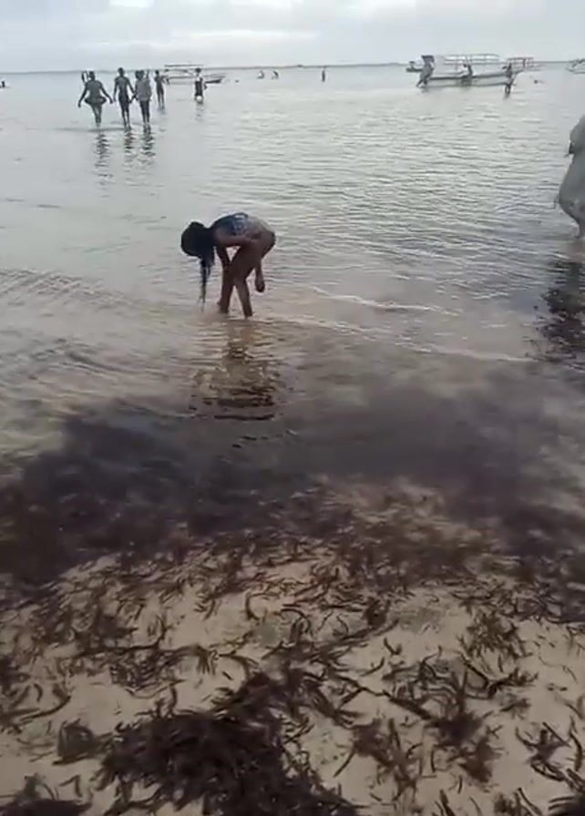 The scene takes place at a beach. In the foreground, there is a large amount of dark seaweed spread across the sandy shore. A young woman, wearing what appears to be a bathing suit and a hat, is bending over in the shallow water near the seaweed. In the background, several people are wading and walking in the water. Further out, there are a few small boats visible on the water. The sky is overcast.