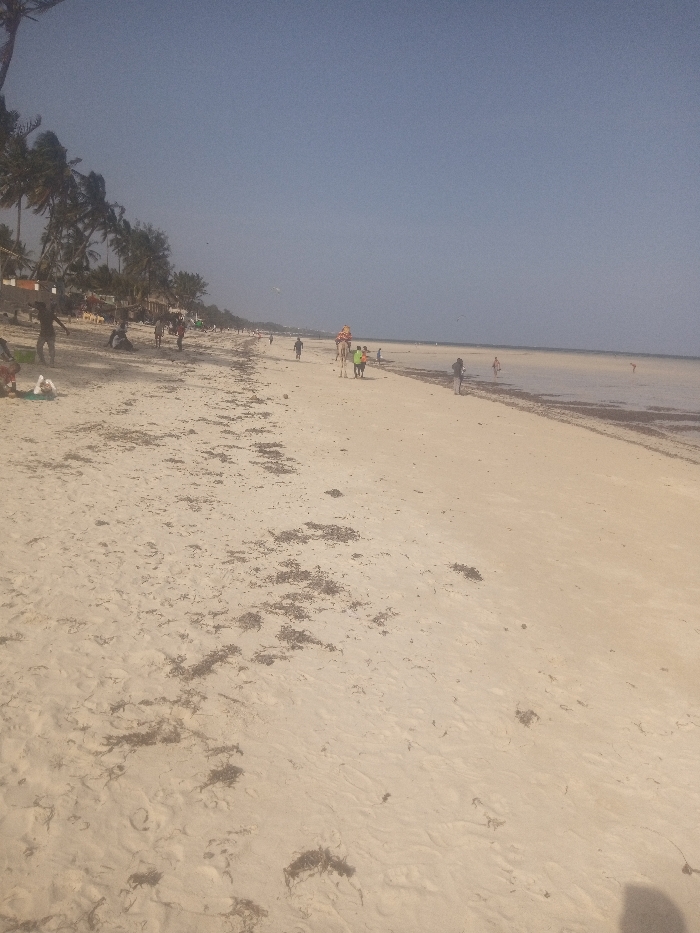 The image depicts an extensive sandy beach under a clear, pale blue sky in Shanzu ward, Kenya. The foreground consists of light-colored sand interspersed with numerous irregular dark clumps, consistent with dried seaweed or vegetation debris. Footprints are visible on the sand. Along the left side of the beach, a dense line of palm trees and other tropical vegetation extends into the distance. Behind these trees, multiple light-colored structures, possibly buildings or resorts, are partially visible. Scattered across the beach are approximately two dozen individuals, predominantly dark-skinned, engaged in various activities. In the mid-ground, a light-colored dromedary camel, adorned with red and yellow fabric, is walking rightward across the sand. Three individuals are closely accompanying the camel; one is leading it, and two others are walking beside it. Further down the beach, additional people are walking or standing near the water's edge. The background shows the Indian Ocean, appearing calm and shallow, with a distinct lighter brown area indicating a low tide extending outwards before meeting the deeper blue horizon. A few distant human figures are discernible in the shallow water. The scene is brightly illuminated by natural daylight.