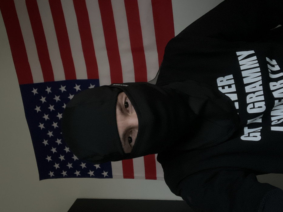 An individual is depicted in an indoor setting in Orsay, France. The subject, viewed from the chest up, is wearing a black balaclava or ski mask that obscures the lower face, revealing only their eyes and upper forehead. Their eyes are directly focused on the viewer. The individual wears a black hooded sweatshirt with white text on the front, partially legible as "...ER Gt A GRAMMY I SWEAR". Behind the subject, an American flag is displayed flat against a light-colored wall. A dark vertical object is visible on the left side of the frame, adjacent to the flag.