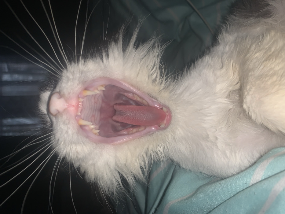 - "A white domestic cat is depicted mid-yawn, captured from a low-angle perspective indoors in the city of Chaikovsky, Russia" by FM-9p7HR2, licensed under CC BY 4.0